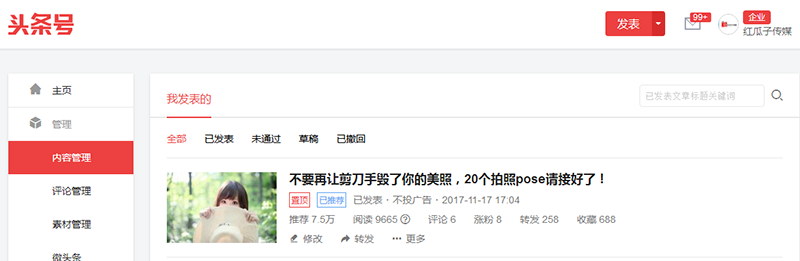翻看日歷,2017年只剩一個月了,不知不覺中在紅瓜子工作已經4個月了,回想兩個月前,老總們在一次周結會議上下達了想要做今日頭條推廣的計劃。初初聽到這個計劃我是挺懵的,今日頭條是個新媒體方向的平臺,毫無寫作經驗的我,絞盡腦汁也寫不出一篇好文章來。不過好在,老總們也說了,先用我們網站的文章發布,看看效果在做后續的調整。