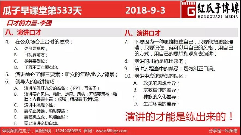 早課堂是由紅瓜子傳媒部分員工和喜歡學習提升自己的小伙伴組織的學習團隊,在每周一至周五早上7:40分開始至8:40進行一個60分鐘學習和自我提升的課堂。期待更多的小伙伴加入我們。