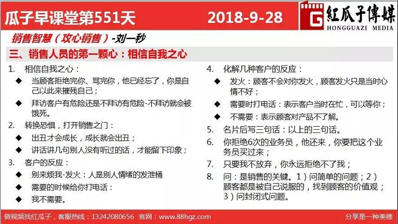 紅瓜子傳媒首頁(yè)>相關(guān)資訊>最新動(dòng)態(tài)>瓜瓜早課堂第551期-銷售人員的第一顆心:相信自我之心