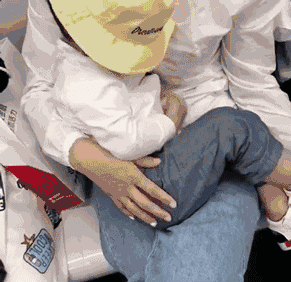 媽媽怕孩子踢到別人,也怕孩子的鞋子弄臟別人的衣服,就一直用手捧著鞋子。