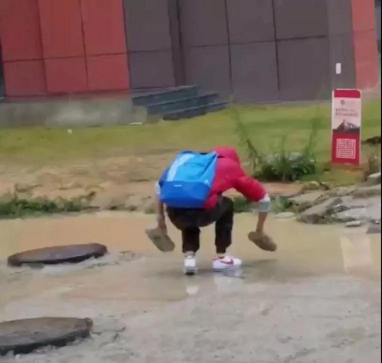 暴雨過(guò)后,一個(gè)背書包的男孩,在一段滿是積水的路上停了下來(lái)。