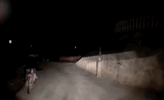 一個(gè)小學(xué)生,夜間騎自行車回家,身后的司機(jī)為他一路照明。