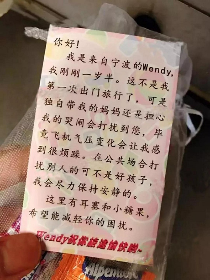 “我剛剛一歲半……獨(dú)自帶我的媽媽擔(dān)心我的哭鬧會(huì)打擾到您,這里有耳塞和小糖果,希望能減輕你的困擾……”