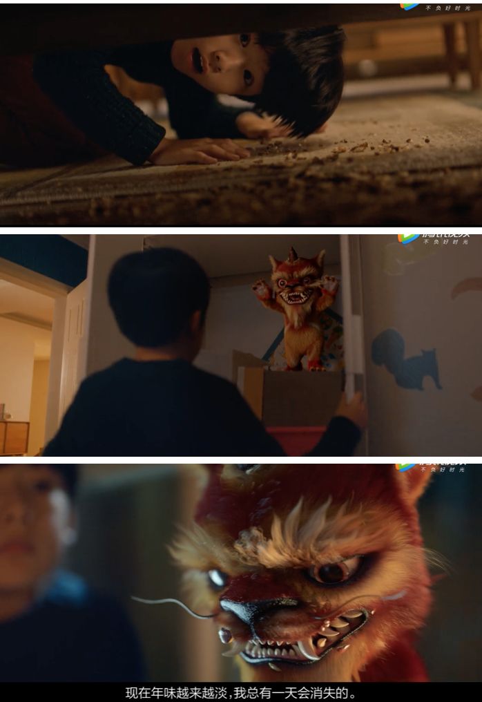 影片中,小男孩偶然發(fā)現(xiàn)家中有“年獸”。可惜因為年味太淡,年獸的身體也越變越小。為了拯救年獸,小男孩召集全家人一起出門迎新年。在熱鬧的氣氛中,年獸終于恢復“真身”。