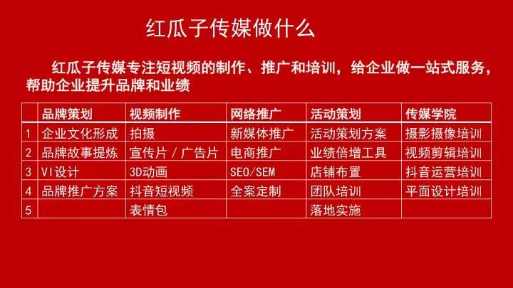 目前這兩個(gè)公司都在正常運(yùn)營(yíng),其中紅瓜子傳媒公司正在做上市推進(jìn),計(jì)劃在2022年上市,紅瓜子傳媒專(zhuān)注短視頻的制作、推廣和培訓(xùn),給企業(yè)做一站式服務(wù),幫助企業(yè)提升品牌和業(yè)績(jī),具體業(yè)務(wù)如下