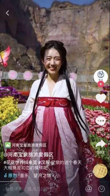抖音區(qū)域互動(dòng)賽正成為品牌商家的標(biāo)配手段。在此次河南寶泉開(kāi)啟的“花花世界抖來(lái)覓”抖音區(qū)域互動(dòng)賽中,更加重視不同風(fēng)格內(nèi)容的創(chuàng)意。例如,除了除常規(guī)的風(fēng)景展示、花田景觀等視頻,更邀請(qǐng)古典漢服達(dá)人、素人探索與景區(qū)結(jié)合的內(nèi)容視頻。