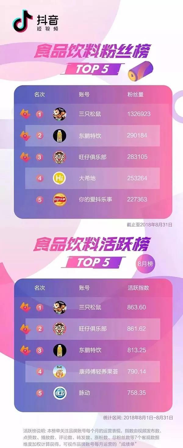 在排行榜中,三只松鼠粉絲量、活躍指數(shù)都踞行業(yè)榜首;東鵬特飲和旺仔俱樂(lè)部在粉絲數(shù)和活躍指數(shù)排行中都躋身前三。此外,“脈動(dòng)”發(fā)布了26個(gè)作品,獲得約150萬(wàn)的播放量;“康師傅輕養(yǎng)果薈”也表現(xiàn)出色,整個(gè)8月共收獲125萬(wàn)點(diǎn)贊。