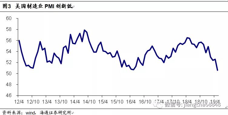 而最大的變化還是在于經(jīng)濟(jì)的下滑。在5月初特朗普重啟貿(mào)易摩擦之前,美國(guó)公布的1季度GDP增速高達(dá)3.1%,而且就業(yè)數(shù)據(jù)也欣欣向榮。但到了6月份,美國(guó)Markit制造業(yè)PMI指數(shù)創(chuàng)下10年新低,新增就業(yè)大幅下滑,國(guó)債利率曲線倒掛,意味著經(jīng)濟(jì)衰退的風(fēng)險(xiǎn)大幅上升。