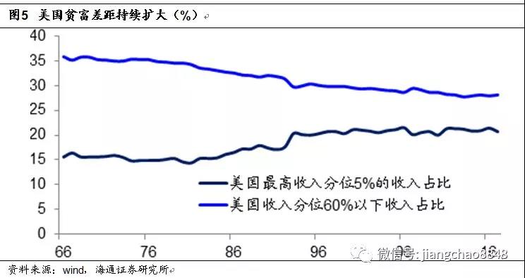 根據(jù)美國(guó)商務(wù)部普查局的數(shù)據(jù),美國(guó)住戶中收入低于60%分位的家庭,其收入占比已經(jīng)從1966年的36%降至目前的28%。而在考慮了通脹的變化以后,美國(guó)收入低于40%分位的家庭,其實(shí)際收入在過(guò)去40年幾乎沒(méi)有變化。