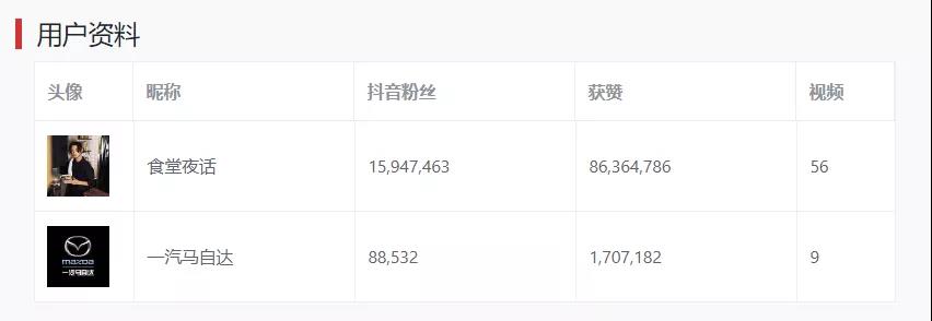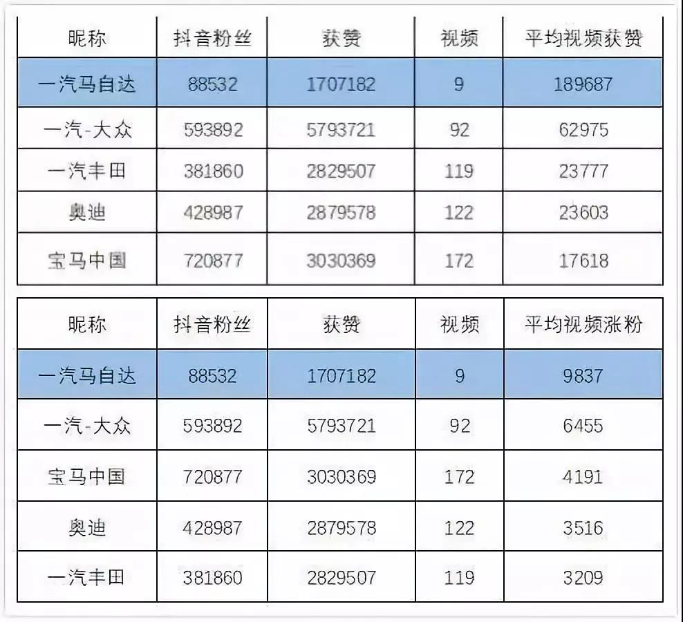 為了直觀體現“一汽馬自達”賬號質量,我們拿出抖音汽車賬號中比較出名的四個賬號寶馬中國,奧迪,一汽大眾,一汽豐田來和一汽馬自達做數據對比。