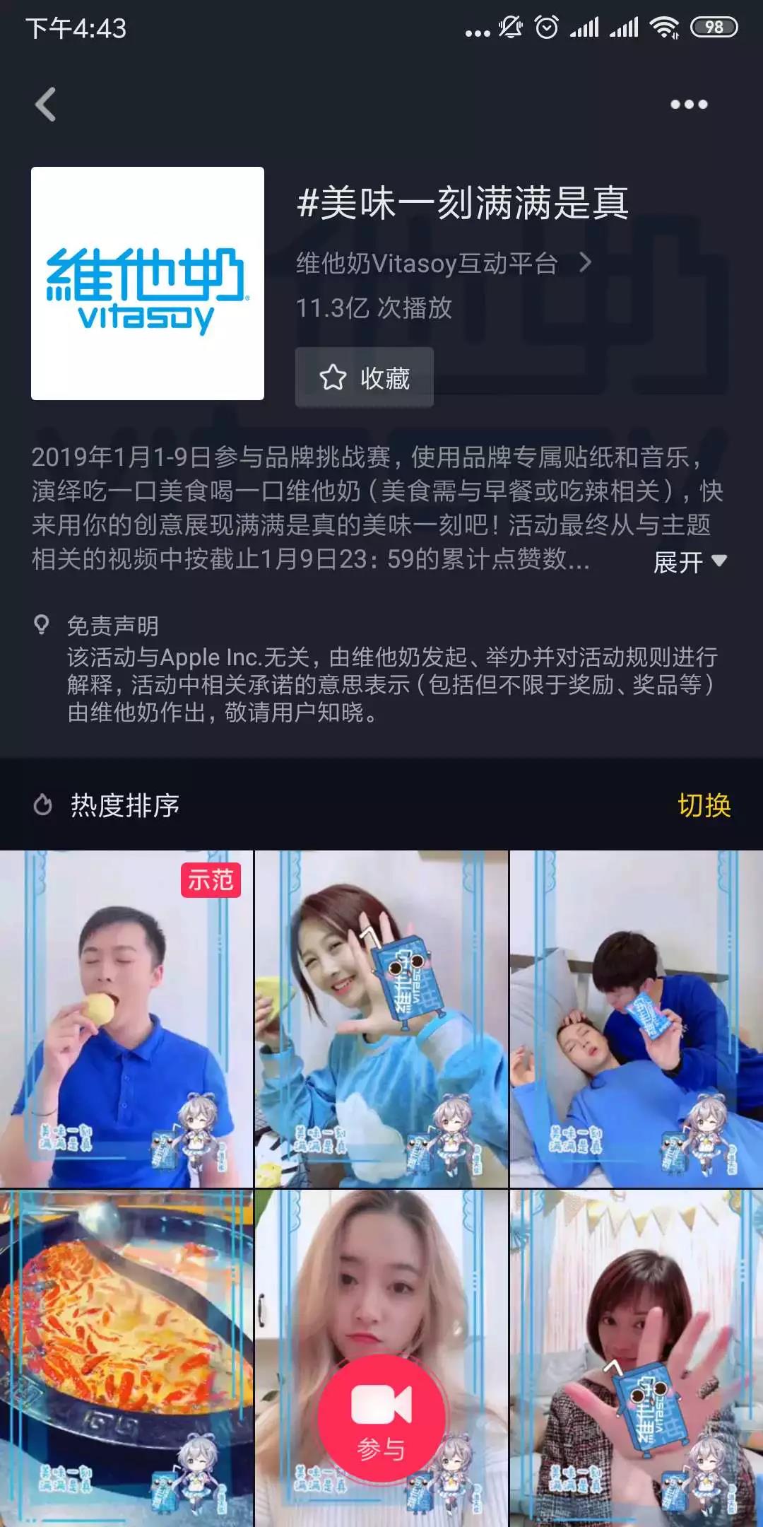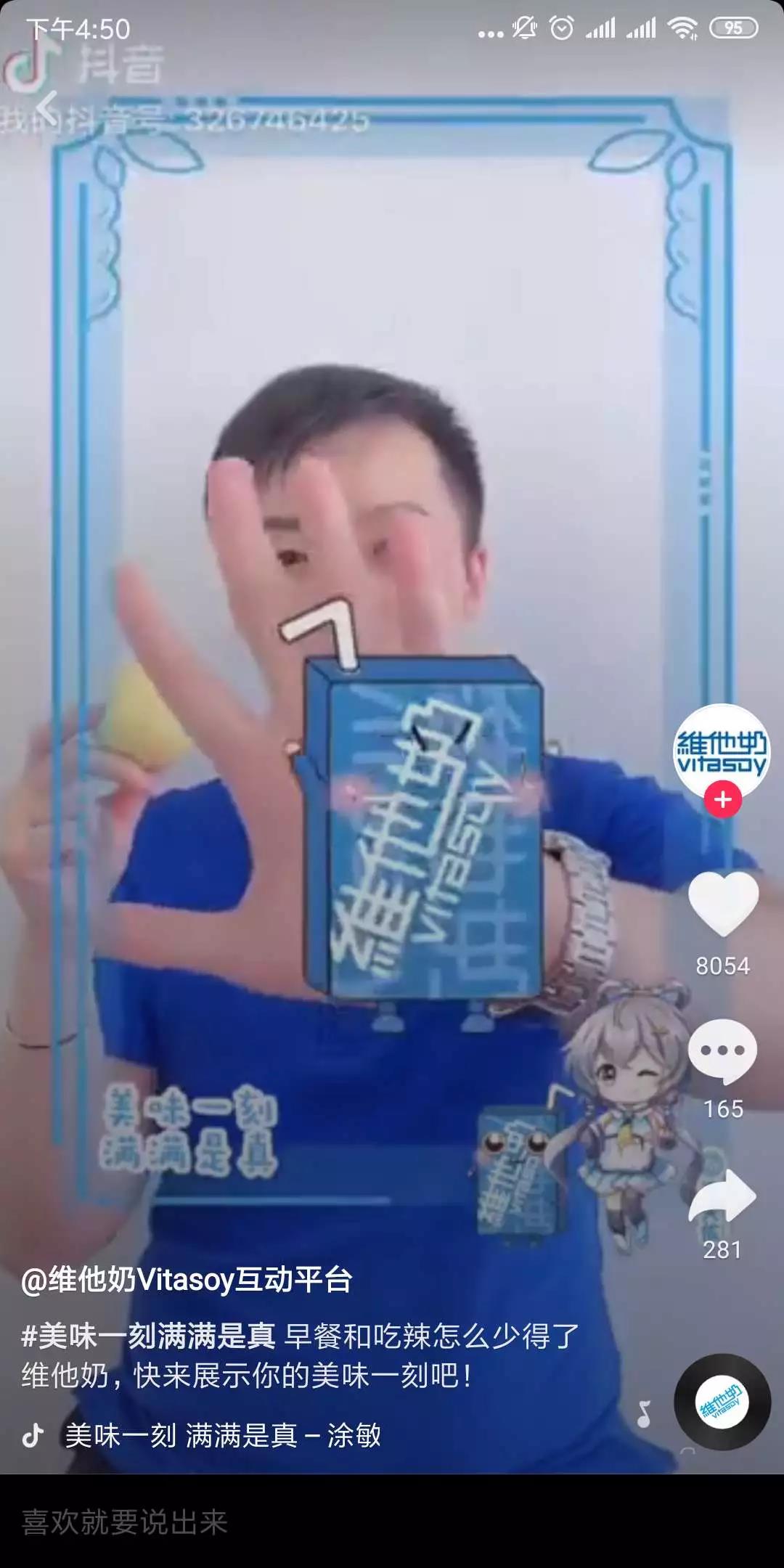 日前,維他奶攜手國(guó)內(nèi)頂級(jí)虛擬偶像洛天依,在抖音發(fā)起了#美味一刻滿(mǎn)滿(mǎn)是真#挑戰(zhàn)賽。因擁有豐富多元的互動(dòng)玩法和借助洛天依IP形象植入,挑戰(zhàn)賽一上線(xiàn)即獲得大批年輕用戶(hù)追捧。同時(shí),此次挑戰(zhàn)賽主題美食絕配維他奶的玩法也迅速占領(lǐng)了整個(gè)抖音圈。
