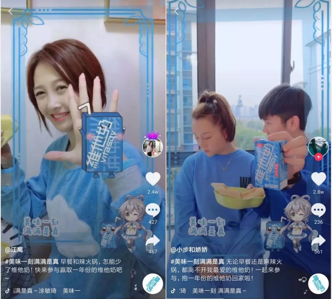外表甜美的@江離 發(fā)揮自身親和力,配合著B(niǎo)GM完美SHOW出早餐一口面包一口維他奶和吃辣時(shí)必備維他奶的喝奶場(chǎng)景。@小步和嬌嬌 則發(fā)揮表演功力,演繹維他奶作為聯(lián)系情侶感情的好物。通過(guò)兩位達(dá)人的親身示范,帶動(dòng)大批粉絲參與挑戰(zhàn)賽,并觸發(fā)粉絲自發(fā)模仿達(dá)人創(chuàng)作出大量高純度優(yōu)質(zhì)內(nèi)容,加速了#美味一刻滿(mǎn)滿(mǎn)是真#挑戰(zhàn)賽內(nèi)容的二次裂變擴(kuò)散。