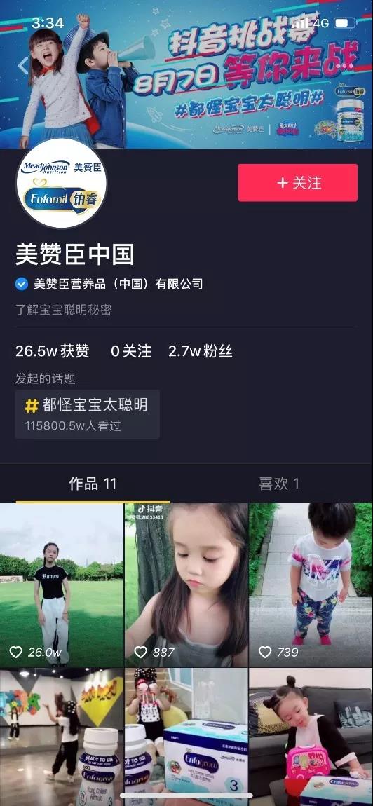 這個8月,美贊臣鉑睿帶動萌娃潮流,開啟母嬰行業抖音營銷的新玩法——截止8月9日,美贊臣鉑睿在抖音舉辦的#都怪寶寶太聰明#挑戰賽,總播放數(vv)超過7億,挑戰賽擁有19萬用戶參與,收獲了2400多萬點贊、90多萬的評論和100多萬次分享。截止發稿前,挑戰賽熱度持續攀升,已經有超過12億總播放數(vv),和破21萬的用戶參與量。