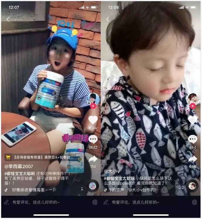 李雨霏2007和大小V的挑戰賽視頻都受到了廣大用戶的歡迎,分別收獲了8.3萬和2.5萬的點贊。李雨霏2007的視頻主打劇情的前后反轉,大小V則是充分運用了自己的激萌之力,粉嫩的小臉蛋和忽閃的大眼睛,讓用戶對美贊臣鉑睿的萌寶印象過目不忘。