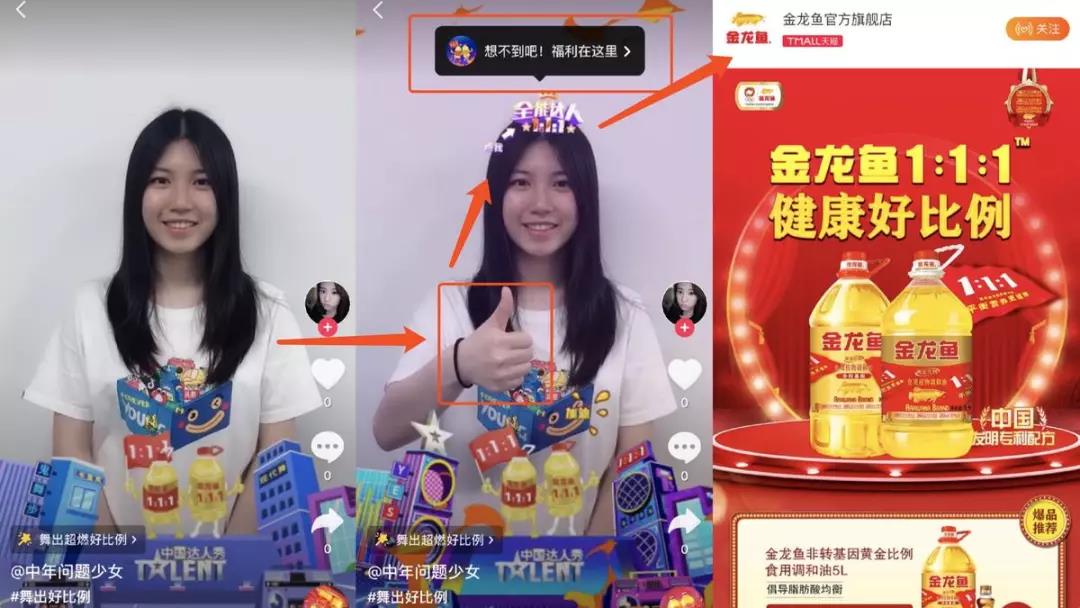 本次活動中,金龍魚1:1:1品牌玩兒了票大的,直接將中國達人秀“搬”上了抖音平臺,每一位用戶都能在活動中化身全能達人,在酷炫的達人秀舞臺與金龍魚小油人互動,同時通過點贊手勢觸發貼紙彩蛋,點擊貼紙即可跳轉金龍魚官方旗艦店,真正做到品效合一。