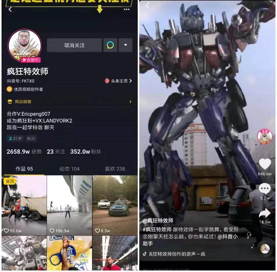 抖音上另一個以制作為中心的賬號,是長沙廣電國有控股公司旗下的@瘋狂特效師。去年5月,因為一條“擎天柱跳舞”的視頻,@瘋狂特效師 幾天功夫播放近1個億,漲粉70萬。運營一年半,現在粉絲已有340多萬。 Land Yok的視頻全是大場面大制作。你可以看到類似《變形金剛》的鏡頭,一輛停在路邊的汽車,突然車門張開、輪胎旋轉,變成巨型機器人跑了起來。你還可以看到技術宅男的硬核表白:女孩面前的高樓突然插滿五彩氣球,男孩一個響指,氣球伴隨高樓全部飛走……