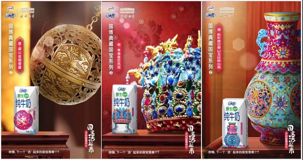 中國國家博物館作為中國優(yōu)秀傳統(tǒng)文化的聚合體,在當下,對于傳統(tǒng)文化的傳承與發(fā)展已經不能僅僅局限于博物館這樣的概念,而是將這些珍貴的傳統(tǒng)文化以一種泛娛樂化的方式傳遞給大眾,尤其是兒童群體。伊利QQ星以助力中國孩子智慧成長的理念發(fā)起本次與國寶的跨界合作,讓每一包牛奶都成為文化傳播的載體。沖破包裝視覺的改變和創(chuàng)新是跨界合作的最基礎最原始的利益層,透過基礎的視覺創(chuàng)新,本次伊利QQ星與中國國家博物館的跨界合作更是將核心利益層進行延伸,讓消費者通過購買產品到達精神表達、文化表達、以及趣味互動。融入故事性、AR互動、社交平臺分發(fā)等創(chuàng)新點,區(qū)別于以往只停留在視覺創(chuàng)新上的泛泛合作。品牌篩選了中國國家博物館中具有高大眾熟悉度的幾件國寶,唐代鎏金香囊、雁魚青銅紅燈、粉彩鏤空轉心瓶和孝端皇后的鳳冠定制成國博典藏國寶系列瓶,并在每包牛奶的國寶圖案中附上了AR功能,打開支付寶掃描出動效講出對應的歷史故事,讓產品本身就成為一個行走的博物館,將伊利QQ星助力孩子智慧成長的理念集中在產品的視覺設計理念中進行傳播。