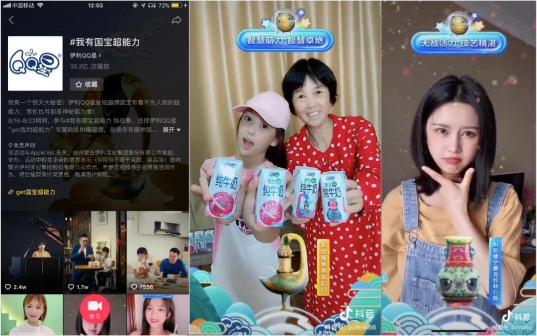 緊接著8月16日,伊利QQ星在抖音發(fā)起#我有國寶超能力#為話題的挑戰(zhàn)賽,參與者通過掃描臉部出現(xiàn)匹配的不同的文物, 分別對應無敵活力、神仙顏力、智慧萌力,出現(xiàn)品牌專屬場景AR貼紙,讓有效曝光與創(chuàng)意場景進行結合。多位KOL參與挑戰(zhàn)賽也調動了UGC視頻參與率,截止到8月25日,參與挑戰(zhàn)賽人數(shù)達36萬以上,貼紙播放量到達1700萬,挑戰(zhàn)賽播放已達到35億次。
